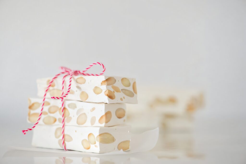- In a saucepan, bring the sugar, honey, and water to a boil. Cook without stirring until a candy thermometer reads 150 °C (302 °F). Remove from the heat.