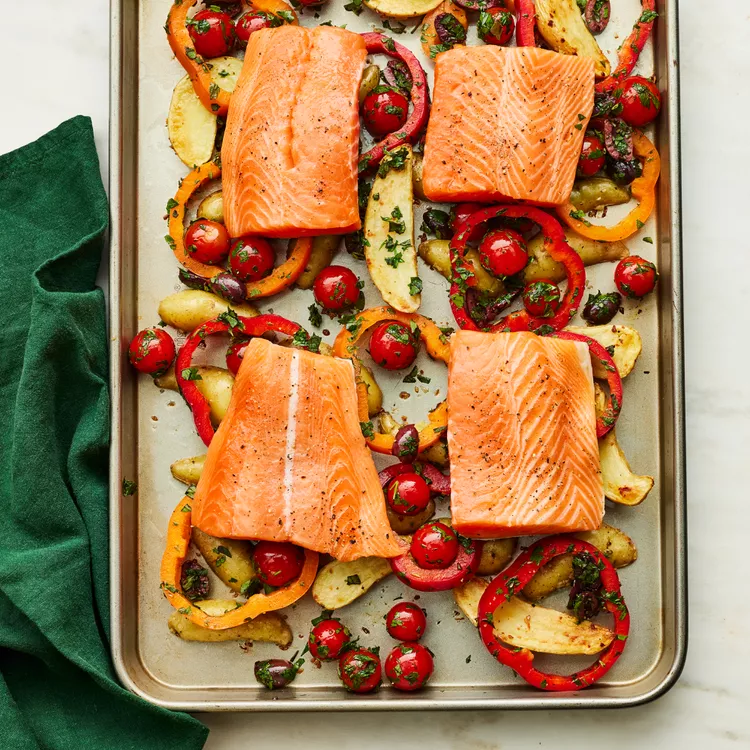 2. Prepare the Vegetables and Fish While the potatoes are in the oven, use the same bowl to combine the sweet peppers, tomatoes, parsley, olives, and oregano. Drizzle with the remaining 1 tablespoon of oil and a pinch of salt and pepper, then toss. Rinse the salmon, pat it dry, and season with salt and pepper.
